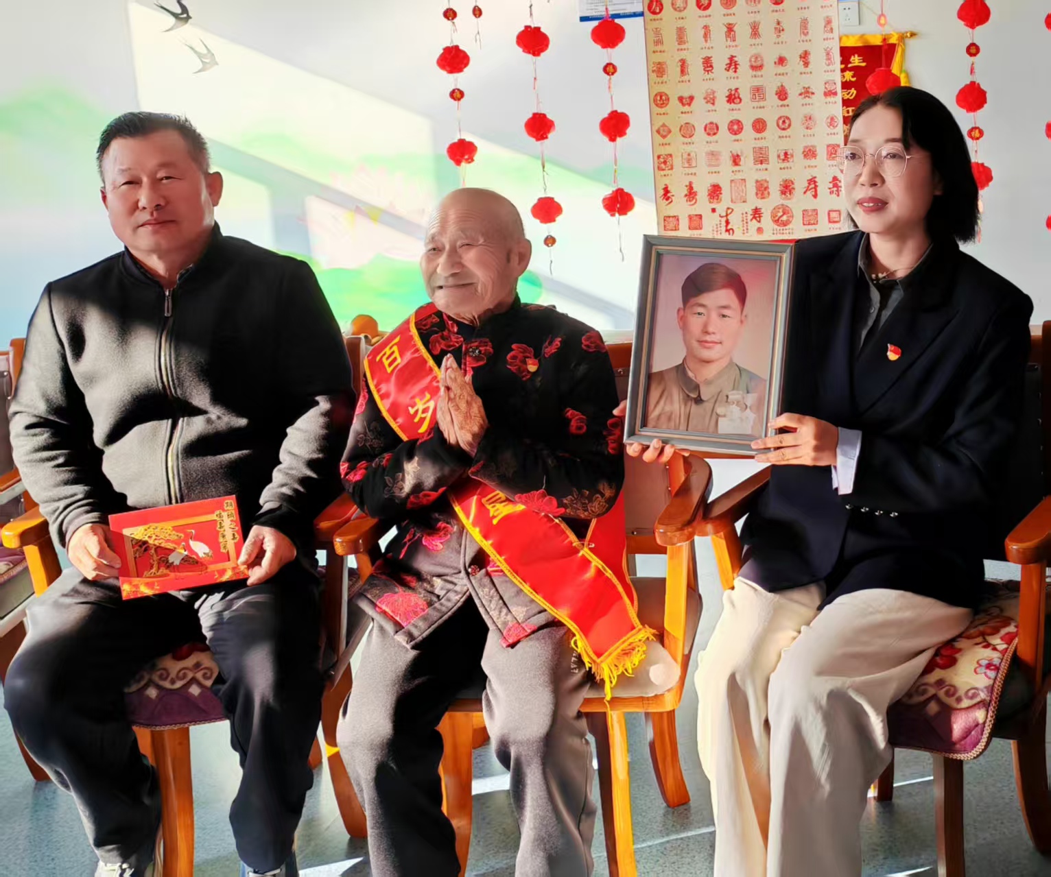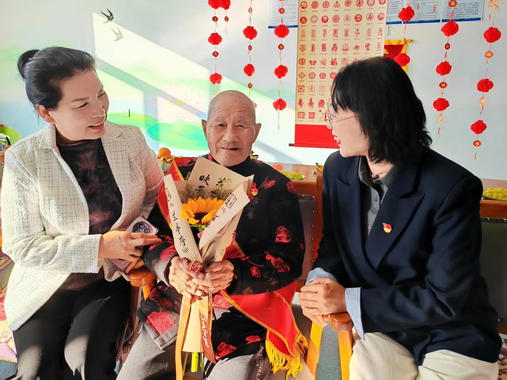 圖1為:10月18日,在開展“敬老月”活動中,三十里大墩社區(qū)王娜書記(左一)、六師奇臺農(nóng)場110社區(qū)吾家樂寶養(yǎng)老院院長史云智(左三),為入住該養(yǎng)老院的百歲老爺爺李文生(左二),佩戴黨徽,送來生日祝福,為李爺爺精心籌備舉辦了“生日會”。陪伴李爺爺?shù)募胰藗優(yōu)槔顮敔斶^“期頤之壽”,讓兵團第一代建設(shè)者李文生老爺爺切身感受到了全社會的關(guān)心與關(guān)愛。