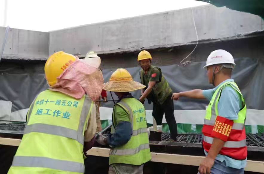 黨員、副經(jīng)理張盛偉(右1)在金山寺車站施工中堅(jiān)守現(xiàn)場督促工程質(zhì)量