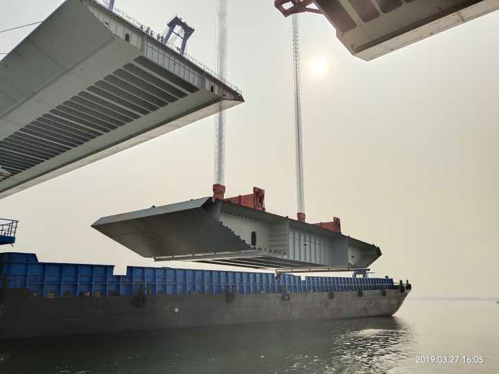 “大橋主橋北邊跨混凝土箱梁施工是大橋建設(shè)的一個(gè)重要難點(diǎn),過去,箱梁都是在空中平臺(tái)上現(xiàn)場(chǎng)制作、現(xiàn)場(chǎng)拼裝。為進(jìn)一步提升工程質(zhì)量,石首長(zhǎng)江公路大橋北邊跨首次采取了地面預(yù)制、空中拼裝的施工方法。北邊跨需要使用36片梁,每片梁寬38.5米、長(zhǎng)5至7米不等、高約4米,梁段最重近1100余噸,把這么一個(gè)龐然大物從地面吊到高幾十米的支架上,再進(jìn)行拼裝,誤差不能超過2毫米。”項(xiàng)目經(jīng)理中國鐵建大橋局李春江向記者介紹到。