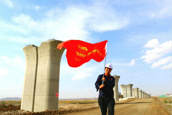 圖、旗幟飄過羊渠溝特大橋