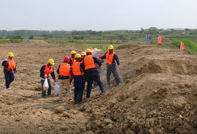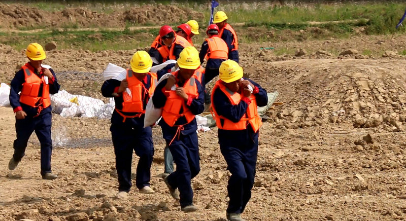 按照演練預案,由于近日連降暴雨,1號導流明渠河水上漲,部分施工區(qū)域有塌壩現(xiàn)象。在得到緊急通知后,項目部防洪度汛指揮中心命令各單位立即啟動應急響應,物資設備組、搶險救援組、醫(yī)療救護組、現(xiàn)場保衛(wèi)組等8組搶險救援人員立即展開行動?,F(xiàn)場保衛(wèi)組組織人員撤離,現(xiàn)場安全撤離4人,1人不慎落水,保衛(wèi)組封鎖危險區(qū)域,救援組進場施救落水人員,物資設備組提前聯(lián)系救護車到指定地點,待落水人員安全救出后,醫(yī)療救護組及時施救并立即送往醫(yī)院救治,觀測到河渠水位有繼續(xù)上漲趨勢,搶險組接到命令加固河堤,此時發(fā)現(xiàn)一處河岸沖刷嚴重,搶險組立即組織挖機裝填片石籠對此處進行加固,加固完成后將機械設備安全轉移出危險區(qū)域,整個演練過程按預定方案圓滿完成。