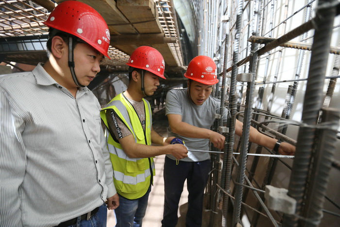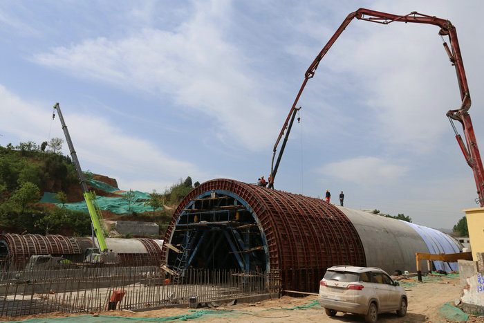 工區(qū)長汪衛(wèi)(左一)、技術(shù)主管王凱崗(右一)檢查隧道邊墻鋼筋間距三工區(qū)管段4公里多,有挖方92萬方,填方98萬方。其中,高填方段總長1.7公里,共設(shè)7座拱涵,跨徑分別為6米和11米,拱涵采用襯砌臺車施工,跨徑11米的拱涵凈空尺寸與高速公路隧道一般大小,為河南省最大跨徑的拱涵。項(xiàng)目總工張寶軍介紹:“這段高填方路基原設(shè)計(jì)為橋梁,因該段位于煤礦采空區(qū),地質(zhì)不穩(wěn),后變更為填方路基。”項(xiàng)目部工程部長周鵬說:“業(yè)主要求6月底完成路基填筑,由于拱涵施工工序復(fù)雜,澆筑一板9米,5天一個(gè)循環(huán),最短的也要45天才能完工。”項(xiàng)目部班子成員與總監(jiān)徐艷軍、駐地吳兆華到現(xiàn)場辦公,將從這里通過的縣道034線,改到路基挖方段通過,改道長度600米,按縣道標(biāo)準(zhǔn)修建。改道后,完工的涵洞就可以及時(shí)填筑路基。