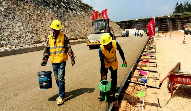 為了打造品質(zhì)工程、加快建設(shè)進(jìn)度,在本次攤鋪施工中,項(xiàng)目建設(shè)團(tuán)隊(duì)選用了新型節(jié)水保濕養(yǎng)護(hù)膜。該材料以新型可控高分子材料為核心,以塑料膜為載體,粘附可吸收自身重量200倍水分的高分子。吸水膨脹后變成透明的晶體,把液態(tài)水變?yōu)楣虘B(tài)水,然后通過(guò)毛細(xì)作用源源不斷度向被養(yǎng)護(hù)體滲透,同時(shí)不斷吸收混凝土水化熱過(guò)程中產(chǎn)生的蒸發(fā)水,平緩了晝夜溫差,確保被養(yǎng)護(hù)體在一個(gè)周期內(nèi),始終處于相對(duì)濕度較高的恒濕潤(rùn)狀態(tài),有效抑制了微裂縫的產(chǎn)生,同時(shí)提高了結(jié)構(gòu)層強(qiáng)度。