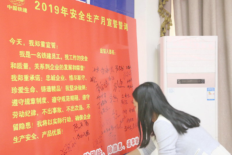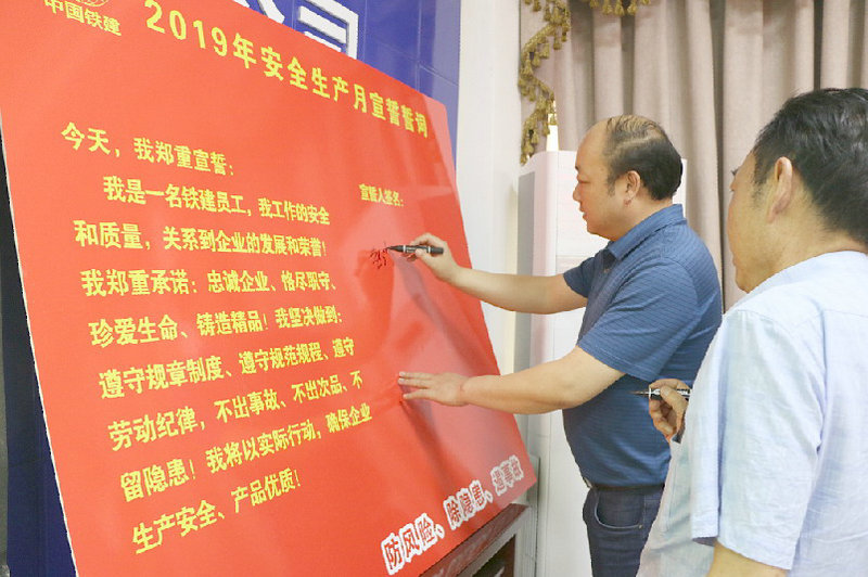 各分部經(jīng)理、書記、架子隊長及技術(shù)主管,分別就落實好“安全生產(chǎn)月”活動的管理措施,作了表態(tài)發(fā)言。全體參會人員進行了安全宣誓,并在“安全生產(chǎn)月”誓言版上鄭重簽下了自己的名字。這也意味著從那一刻起,他們每個人都把安全生產(chǎn)的責(zé)任寫進了心中、扛在了肩上。