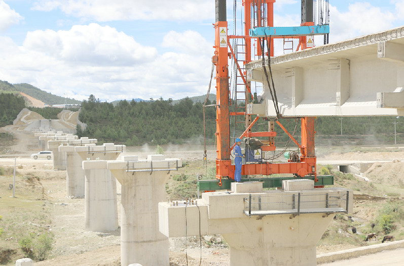 麗香鐵路即將架設(shè)的第一片T梁緩緩?fù)七M(jìn)