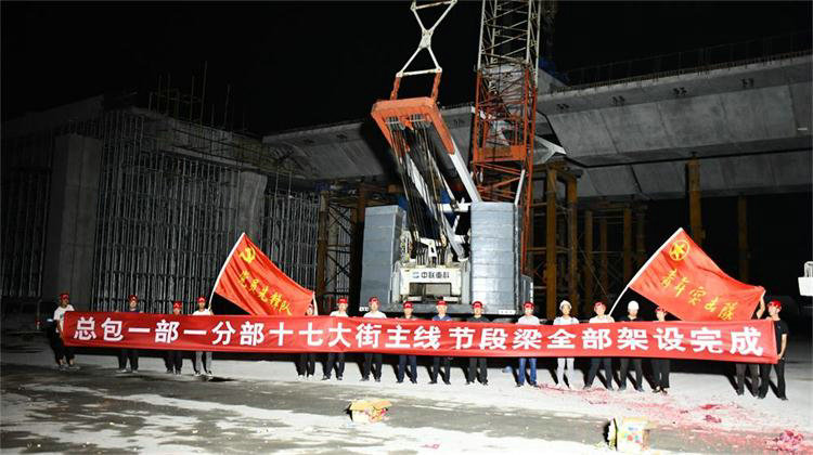 公司承建鄭州市四環(huán)線及大河路快速化工程東四環(huán)段是鄭州市乃至全省市政道路中投資規(guī)模和工程體量最大、建設(shè)模式和施工工藝最新、統(tǒng)籌協(xié)調(diào)和實施要求最高的一個特大型城市立體交通項目,本次十七大街主線高架橋的架設(shè)共使用264榀預(yù)制節(jié)段梁,采用了世界領(lǐng)先的新型節(jié)段預(yù)制拼裝技術(shù)。為確保節(jié)段梁架設(shè)任務(wù)的完成,項目部克服市政工程環(huán)保要求高,裝配式節(jié)段拼裝梁施工技術(shù)難度高、征地拆遷涉及高壓線纜、燃?xì)夤艿蓝嗟壤щy,積極組織專業(yè)橋梁施工人員、合理排布大型設(shè)備機具,開展了“抓安全、重質(zhì)量、賽進度”勞動競賽,項目部數(shù)百名參建者動用十余臺300噸級履帶吊聯(lián)合橋面吊共同作業(yè),僅用三個月的時間完成了跨十七大街主線高架橋節(jié)段梁的全部架設(shè)。