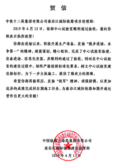 中國鐵路工程建設網訊(通訊員 謹 愚)6月13日,擔負南沿江城際鐵路6標段施工任務的中鐵十二局集團項目經理部自組織隊伍上場以來,不能不靠,主動與地方相關部門接洽,積極籌備,贏得中國鐵路上海鐵路局集團有限公司南沿江城際鐵路建設指揮部組建以來的第一封賀信。賀信中說:你部進場以來,超前謀劃,精心組織,完成了中心試驗室臨建、設備進場、信息化安裝,并順利的通過了驗收,樹立了中心試驗室建設的新標桿!