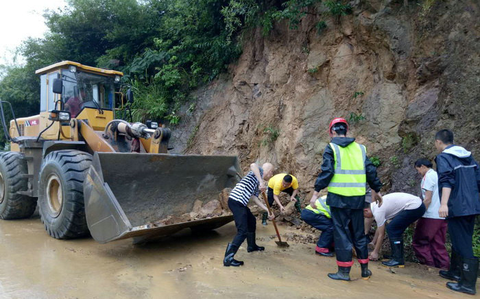 清理公路塌方 拌合站和預制場處在地勢低洼處,旁邊緊鄰河溝,一下暴雨就對場地沖刷嚴重。值班人員冒著大暴雨沿觀察河水上漲和山體動向,發(fā)現(xiàn)洪水夾著泥石流把剛澆筑的龍門吊基座掏空,地磅也漂浮起來,搶險人員立即用挖機裝石塊進行圍擋,連續(xù)備戰(zhàn)3個多小時,保住了基座和地磅不被洪水沖走。