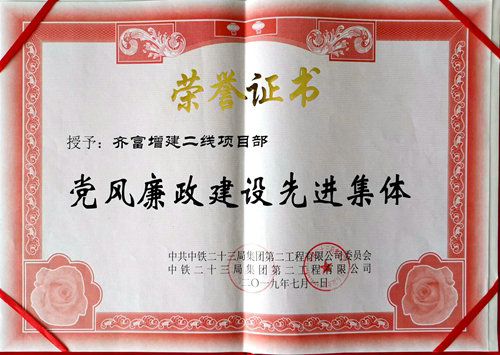 2019年,中鐵二十三局集團(tuán)二公司齊富增建二線項(xiàng)目部高舉習(xí)近平新時(shí)代中國特色社會(huì)主義思想偉大旗幟,深入學(xué)習(xí)貫徹黨的十九大精神,以黨風(fēng)廉政建設(shè)為統(tǒng)領(lǐng),思想建黨、紀(jì)律強(qiáng)黨、制度治黨協(xié)同發(fā)力,嚴(yán)格落實(shí)中央精神,堅(jiān)持不懈糾正“四風(fēng)”,每名黨員干部均自覺簽署了“廉潔責(zé)任書”,毫不動(dòng)搖地推動(dòng)全面從嚴(yán)治黨、黨風(fēng)廉政建設(shè)和反腐敗工作。經(jīng)中共中鐵二十三局集團(tuán)第二工程有限公司委員會(huì)、中鐵二十三局集團(tuán)第二工程有限公司綜合評定,授予齊富增建二線項(xiàng)目2019年度“黨風(fēng)廉政建設(shè)先進(jìn)集體”榮譽(yù)稱號,同時(shí),該項(xiàng)目人員王鐵超、王雷被授予“黨風(fēng)廉政建先進(jìn)個(gè)人”榮譽(yù)稱號。