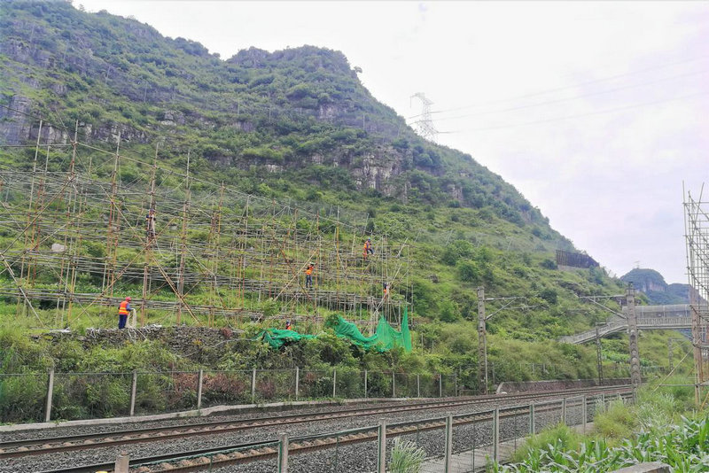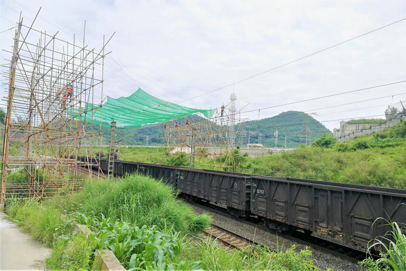 為在最短的時(shí)間內(nèi)完成遷改任務(wù),項(xiàng)目部提前做好各項(xiàng)準(zhǔn)備工作,并安排精兵強(qiáng)將盯守“天窗點(diǎn)”時(shí)間。7月1日11:25分,隨著六盤水工電段安順車間工長(zhǎng)一聲令下,項(xiàng)目部施工人員開始拆除跨越既有滬昆線絕緣網(wǎng)施工,僅用25分鐘,提前完成了拆除絕緣網(wǎng)施工任務(wù)。