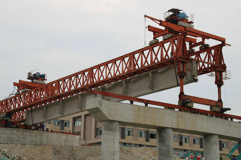 該立交橋全長(zhǎng)289m,設(shè)計(jì)T梁60片,其中含有24片45米T梁,24片34米T梁和12片30米T梁,單片預(yù)制T梁吊裝重量最重為178噸,最輕為95噸。為保證架梁作業(yè)順利進(jìn)行,中鐵七局四公司嚴(yán)格按照工作部署,從現(xiàn)場(chǎng)架梁設(shè)備的安裝、調(diào)試、T梁的吊裝、運(yùn)輸、架設(shè)、現(xiàn)場(chǎng)防護(hù)和后勤保障等方面精心籌劃、嚴(yán)抓落實(shí),在架梁過(guò)程中,指派專人盯控,緊盯安全細(xì)節(jié),與項(xiàng)目部及作業(yè)隊(duì)積極溝通,密切合作,確保實(shí)現(xiàn)架梁作業(yè)零事故。