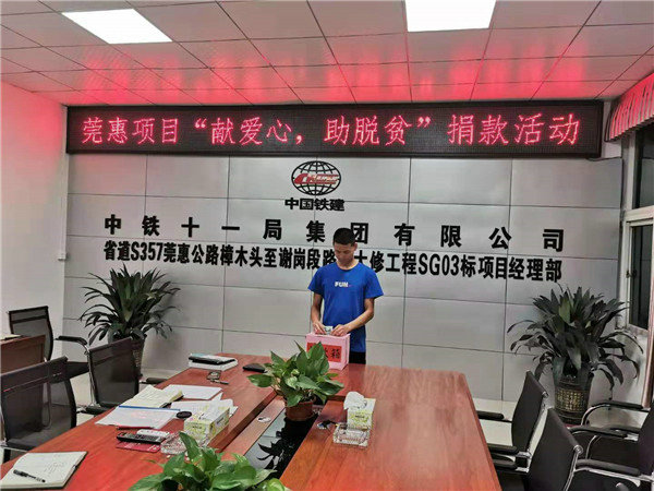 贈(zèng)人玫瑰,手留余香。7月9日,中鐵十一局二公司莞惠項(xiàng)目積極響應(yīng)公司黨委號(hào)召,落實(shí)“獻(xiàn)愛(ài)心助脫貧”活動(dòng),項(xiàng)目領(lǐng)導(dǎo)帶頭,全體黨員、團(tuán)員青年踴躍捐款,紛紛獻(xiàn)出一份愛(ài)心。大家50元、100元量力而行。項(xiàng)目經(jīng)理李峰作表率捐款500元;項(xiàng)目書(shū)記因出差缺席捐款現(xiàn)場(chǎng),但仍通過(guò)轉(zhuǎn)賬獻(xiàn)上自己的一份愛(ài)心愛(ài)心捐款500元。項(xiàng)目同時(shí)開(kāi)通了支付寶和微信捐款便捷方式以方便大家獻(xiàn)愛(ài)心。