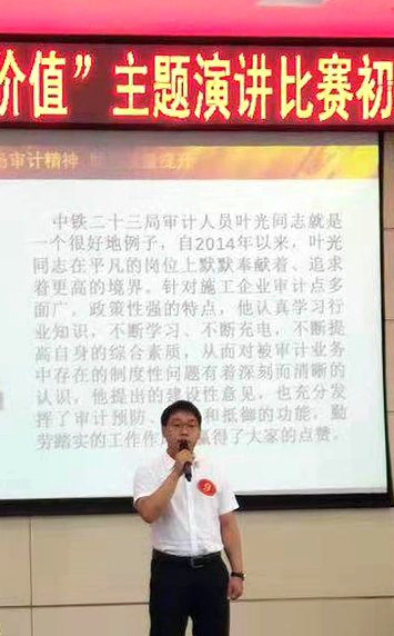 “一名優(yōu)秀的審計工作者,必須時刻用審計精神激勵自己,實事求是、堅持原則,用奉獻精神為企業(yè)發(fā)展保駕護航,因為我們的一言一行代表著審計部門的形象……”這是7月11日,在中國鐵建股份有限公司舉辦的“助力品質(zhì)鐵建、彰顯審計價值”主題演講比賽(西安賽區(qū))上,代表中鐵二十三局集團參賽的二公司哈牡電氣化項目部財務部黨哲激情演講的開場白。