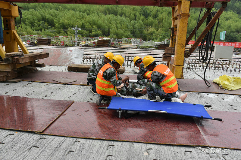 本次演練事故事是由攔魚河5#橋橋面上的架橋機(jī)電纜老化,引起配電箱著火造成電器火災(zāi),現(xiàn)場發(fā)現(xiàn)著火點(diǎn)的人員呼救,另一名施工人員在橋梁施工,由于情況緊急驚慌失措不慎從架橋機(jī)上掉到橋面。根據(jù)事故情況,項(xiàng)目部啟動專項(xiàng)應(yīng)急預(yù)案,根據(jù)專項(xiàng)應(yīng)急預(yù)案,本次有7個小組參與實(shí)施救援,救援分6個步驟進(jìn)行,每個小組人員都已最快的速度抵達(dá)現(xiàn)場,并進(jìn)行施救,整個演練過程有條不紊推進(jìn),受傷人員在最短的時間內(nèi)送往醫(yī)院進(jìn)行治療,未有生命安全。
