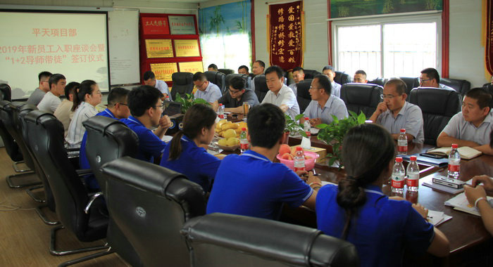 “1+2 導(dǎo)師帶徒”簽字儀式 在7名新入職員工及4名頂崗實習(xí)生自我介紹環(huán)節(jié)中,他們表示:非常高興也非常榮幸的加入到平天項目這個大家庭,這里不僅為他們提供了一個成長鍛煉、展示自我的良好平臺,也讓他們有機會認(rèn)識更多的新同事、新朋友;他們還表示,在以后的工作中,方方面面的知識都需要向老職工學(xué)習(xí),希望能得到大家的認(rèn)真指教,使自己快速成長。
