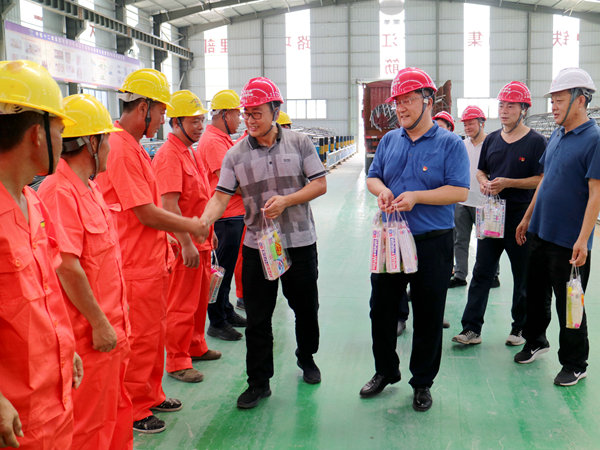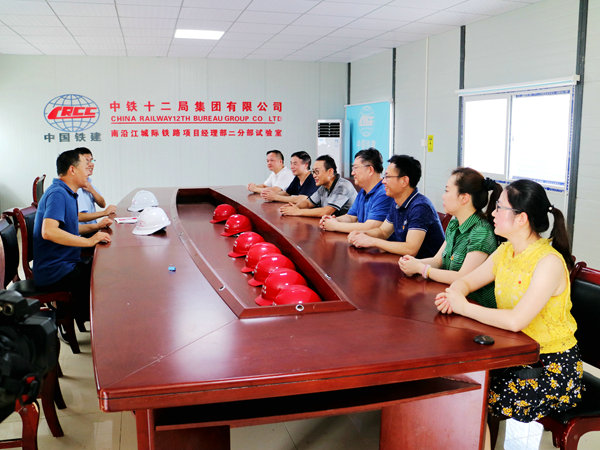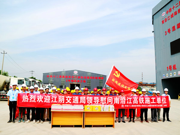 中國(guó)鐵路工程建設(shè)網(wǎng)江陰訊(通訊員 鄭建軍 張 慧)酷暑盛夏,驕陽(yáng)似火。在連續(xù)多日將近40度高溫的南沿江城際鐵路建設(shè)工地,建設(shè)者們?nèi)淌苤鵁崂藫涿娴母邷匾廊痪o張繁忙的工作著。7月31日,江蘇省江陰市交通運(yùn)輸局副局長(zhǎng)傅士才、鐵路建設(shè)服務(wù)中心主任謝曉東等領(lǐng)導(dǎo)帶隊(duì)專程前來(lái)慰問(wèn)了中鐵十二局集團(tuán)二分部的建設(shè)者們,他們先后為拌合站和鋼筋加工場(chǎng)的員工們送上礦泉水、飲料、牙食具、花露水和解暑茶包等溫馨的清涼快意,表達(dá)了一份誠(chéng)摯的關(guān)懷之情。分部書記陳德東組織了歡迎儀式后,先后陪同參觀了鋼筋加工場(chǎng)車間和中心試驗(yàn)室,并進(jìn)行了親切交流。