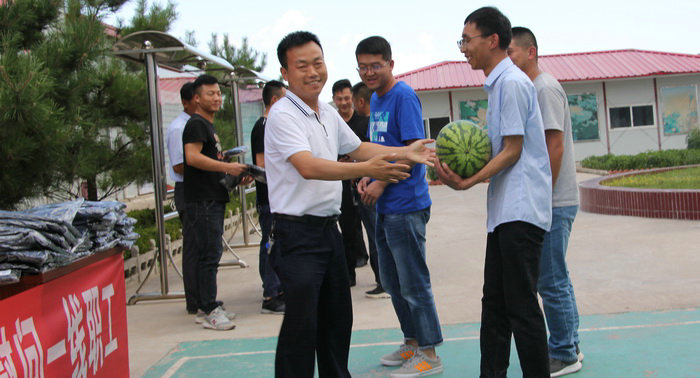 公司副總經(jīng)理魏惠民為員工分發(fā)西瓜