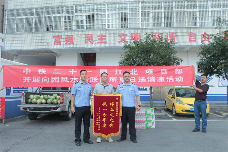 8月5日,中鐵二十一局一公司武漢江北項(xiàng)目部到湖北省黃岡市團(tuán)風(fēng)縣水陸派出所開展了“夏日炎炎送清涼,共建警企一家親”暑期慰問活動(dòng),為派出所贈(zèng)送了感謝錦旗,感謝派出所一直以來對(duì)項(xiàng)目部的幫助。