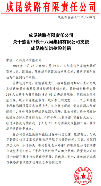 本站成都電 (記者 伍振 通訊員 李陽(yáng) 馬士力)日前,成昆鐵路有限責(zé)任公司向中鐵十八局集團(tuán)發(fā)來(lái)關(guān)于支援既有成昆鐵路防洪搶險(xiǎn)的感謝函,感謝中鐵十八局集團(tuán)在既有成昆鐵路防洪搶險(xiǎn)過(guò)程中行動(dòng)迅速、組織有力,為成昆鐵路盡快恢復(fù)正常運(yùn)輸秩序爭(zhēng)取了寶貴的時(shí)間,對(duì)中鐵十八局集團(tuán)顧全大局、不計(jì)得失、奮力搶險(xiǎn)表示感謝,并在成昆公司管內(nèi)作出通報(bào)表?yè)P(yáng),納入下半年信用評(píng)價(jià)予以加分獎(jiǎng)勵(lì)。