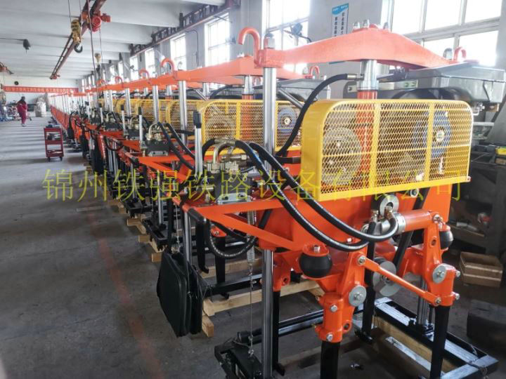 4、將走行架放在線路上,走行輪要對正兩根鋼軌,將升降缸提到最上端的兩臺搗固機(jī)依次推到放平的走架上,分別對準(zhǔn)位置,將前后大插銷插入定位孔內(nèi),再將下道架折起,把下道架上的支撐掛鉤與走行架的勾環(huán)勾住。作業(yè)中,操縱司機(jī)最好面向來車方向。