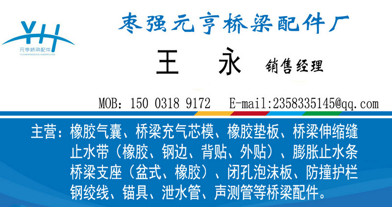 棗強元亨橋梁配件廠坐落于橡膠之鄉(xiāng)的河北衡水市,集研發(fā)、生產(chǎn)、銷售、咨詢和應(yīng)用服務(wù)于一體的專業(yè)生產(chǎn)多用途氣囊容器產(chǎn)品的獨資企業(yè)。我廠擁有專業(yè)技術(shù)人員和專業(yè)機械設(shè)備及專業(yè)焊工隊伍。 我廠以專業(yè)的隊伍、嚴(yán)謹(jǐn)?shù)墓芾?、超卓的設(shè)備,專業(yè)生產(chǎn)質(zhì)量一流的橋梁配件。主營:橡膠氣囊,工程橡膠充氣芯模,高壓氣囊,橋梁橡膠充氣芯模,市政管道封堵氣囊,A級全膠氣囊,帶法蘭盤橡膠氣囊,帶拉手純膠氣囊,高速公路鐵路梁板氣囊,混凝土襯托芯模,隧道涵洞氣囊,邊溝芯膜,箱涵芯模,閉水實驗堵,閉氣試驗堵,試驗堵,橡膠護(hù)舷,封堵氣囊閉水堵,橡膠氣堵,充氣氣堵,充氣氣囊,橡膠氣囊布,排水管道堵水工具,管道用氣囊,橋梁板式支座,板式支座,橡膠膠板(厚度1mm-100mm),帶孔橡膠支座,橡膠止水帶,鋼邊止水帶,止水環(huán),止水條,接頭機,止水帶膠水,橋梁支座,橋梁伸縮裝置,閉孔泡沫板,雙組份聚硫密封膠(膏),護(hù)欄支架,聲測管,泄水管,鋼絞線,錨具等橋梁配件。
