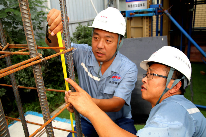 3、中鐵十八局集團(tuán)大都公司鄭州航空港棚改項(xiàng)目經(jīng)理徐春雷(左)、項(xiàng)目書(shū)記李雨辰在檢測(cè)鋼筋間距( 伍振 攝 )