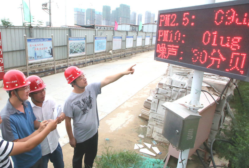 6、中鐵十八局集團(tuán)大都公司鄭州航空港棚改項(xiàng)目書(shū)記李雨辰(右二)、建安公司項(xiàng)目書(shū)記王熊虎(右一)、副經(jīng)理劉少龍?jiān)诓榭喘h(huán)境監(jiān)測(cè)數(shù)據(jù)(伍振 攝)