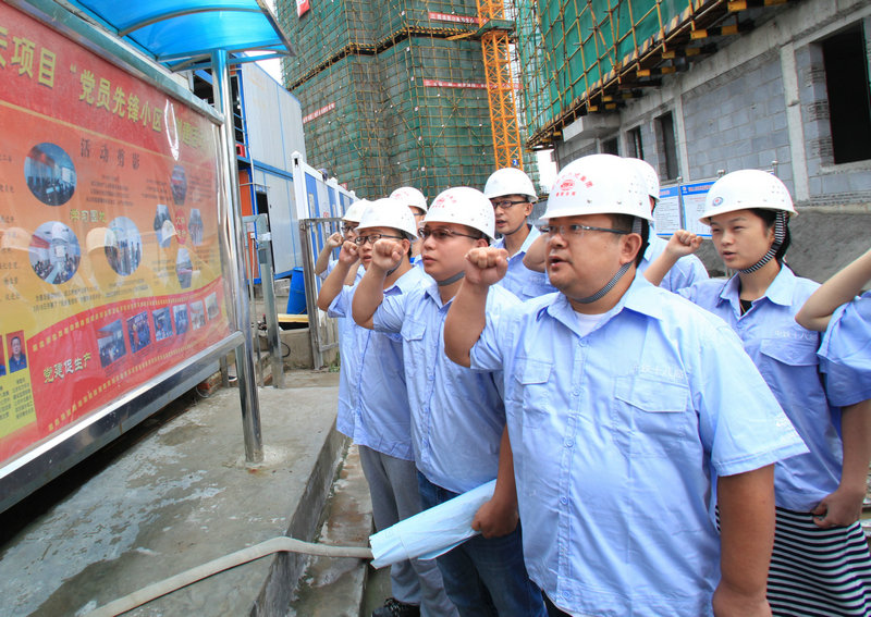 5、中鐵十八局集團(tuán)建安公司鄭州航空港棚改項(xiàng)目經(jīng)理任傳輝(右二)帶領(lǐng)青年突擊隊(duì)宣誓(伍振 攝)