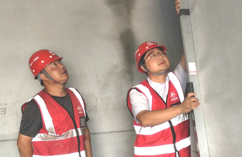 4、中鐵十八局集團(tuán)四公司鄭州航空港棚改項(xiàng)目經(jīng)理王鵬翃(右)檢查墻面抹灰平整度( 伍振 褚英 攝 )