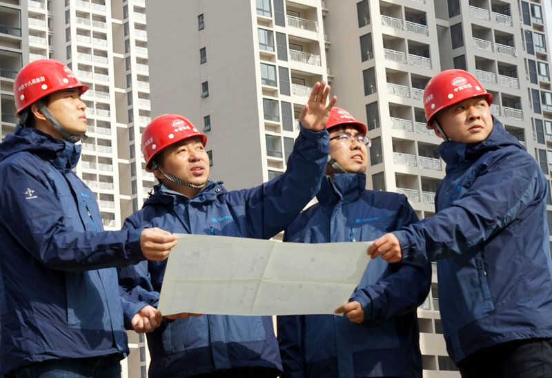 2、中鐵十八局集團(tuán)鄭州航空港棚改區(qū)項(xiàng)目指揮長(zhǎng)郭北碩(左二)在現(xiàn)場(chǎng)辦公( 伍振 安謀 攝 )