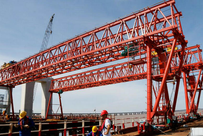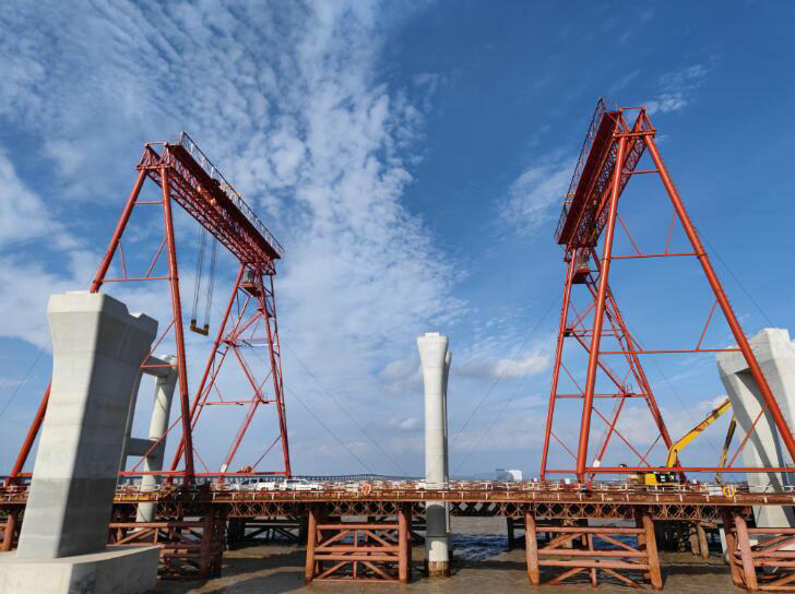 濱?;ネㄔO(shè)計(jì)142片鋼箱梁、299片疊合梁,單片重20—30噸、長(zhǎng)20—60米,架設(shè)好的30片梁,一部分是通過公路從舟山梁場(chǎng)運(yùn)至現(xiàn)場(chǎng),一部分是海上運(yùn)輸至石化區(qū)碼頭,轉(zhuǎn)運(yùn)至工地。由于梁體超長(zhǎng)超寬,公路運(yùn)輸安全風(fēng)險(xiǎn)大,租賃石化區(qū)碼頭卸梁再轉(zhuǎn)運(yùn),費(fèi)時(shí)費(fèi)力,影響進(jìn)度。該項(xiàng)目部從安全、效率、成本等多方面考慮,決定在互通區(qū)建1座卸梁站、2座提梁站。前期經(jīng)過實(shí)地勘察,確定了卸梁站和2座提梁站位置,組織人員編制出實(shí)施方案,經(jīng)多方專家評(píng)審?fù)ㄟ^,報(bào)業(yè)主、鎮(zhèn)海區(qū)海事處審批后付諸實(shí)施。在聯(lián)系聯(lián)系廠家加工龍門吊的同時(shí),組織力量拆除區(qū)域內(nèi)的棧橋,深挖卸梁站航道內(nèi)的淤泥,克服多種困難,于7月13日建成36,4米高、16,8米寬的卸梁站。在兩座提梁站建設(shè)中,該項(xiàng)目部戰(zhàn)勝高溫、大風(fēng)大雨等極端天氣造成的困難,8月初建成1號(hào)提梁站并通過有關(guān)方面驗(yàn)收。在2號(hào)提梁站施工中,遭遇兩次強(qiáng)臺(tái)風(fēng),施工受阻,項(xiàng)目部采取科技公關(guān)、優(yōu)化資源等舉措,將臺(tái)風(fēng)造成的損失奪了回來,如期建成74米長(zhǎng)、36米高、15米寬、負(fù)荷200噸的2號(hào)提梁站。兩座提梁站和1座卸梁站使用鋼材250余噸。