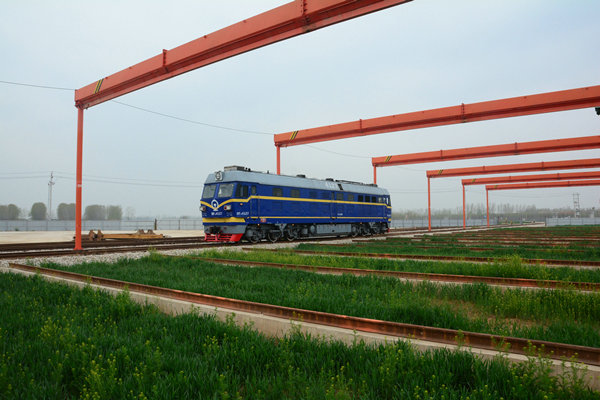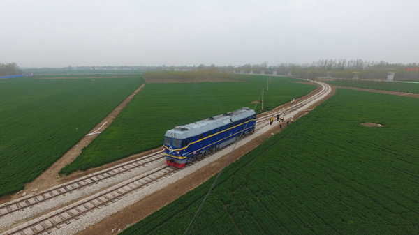 —— 4月2日上午,一列DF4內(nèi)燃機車緩緩駛進魯南高鐵項目薛家莊鋪軌基地,開始對場內(nèi)線路進行機車軋道作業(yè)。