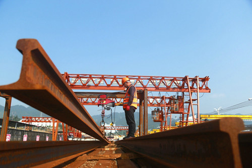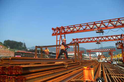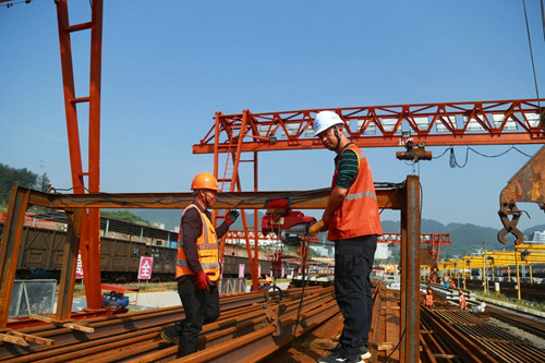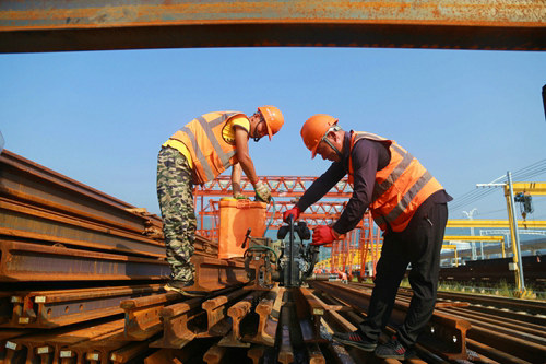 工人們對(duì)調(diào)整好位置的鋼軌輕松進(jìn)行鉆孔作業(yè)