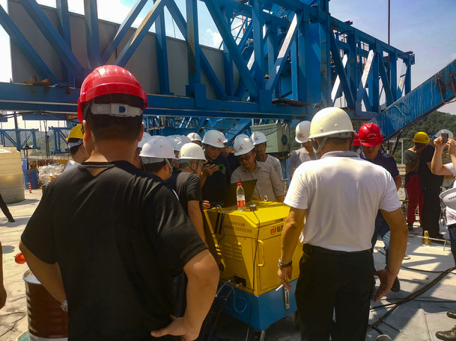 會上,自動張拉設(shè)備廠家湖南聯(lián)智公司對軟件進(jìn)行了模擬測試,中鐵十一局常益長鐵路項(xiàng)目部總工程師李盛春介紹了自動張拉施工經(jīng)驗(yàn)。上午10:00在中鐵十一局常益長鐵路項(xiàng)目黃橋大道特大橋(40+72+40)m連續(xù)梁89#墩A4段進(jìn)行了現(xiàn)場連續(xù)梁張拉,與會人員現(xiàn)場觀摩了智能張拉的全過程,張拉的各項(xiàng)數(shù)據(jù)指標(biāo)均符合設(shè)計(jì)及規(guī)范要求。與會人員對本次連續(xù)梁智能張拉施工贊不絕口,表示會立即組織本標(biāo)段連續(xù)梁施工人員進(jìn)行業(yè)務(wù)培訓(xùn),汲取成功經(jīng)驗(yàn),切實(shí)提高自身現(xiàn)場管理水平,使連續(xù)梁施工水平更上一個(gè)臺階。