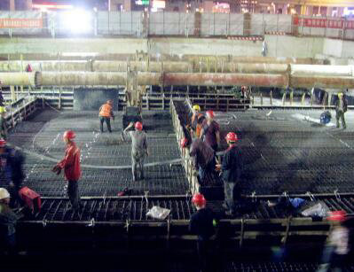 為加快進度,項目部果斷決定1、2號風亭同步施工、流水作業(yè),基礎出來一段施工一段,結(jié)構施工、挖運土方晝夜進行。項目部領導分工負責抓點,并帶領部室負責人輪流值夜班,責任到人地向前趕。