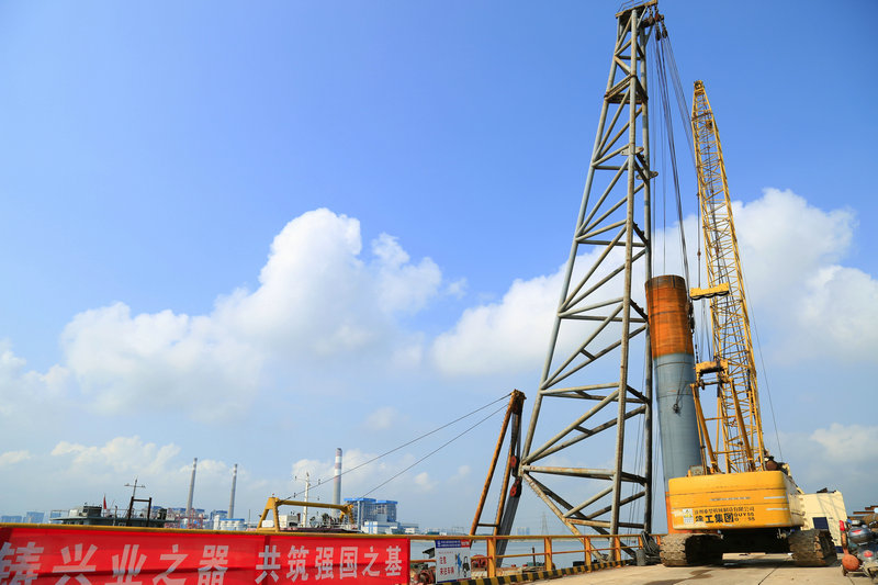 調順跨海大橋主橋位于全橋92號墩至93號墩,由中鐵大橋局承建施工。當天下午4時許,首根長38米、內徑2.9米、重60.2噸的“定海神針”,在“粵航工07號”打樁船插打下,歷時近3個小時插打到位。