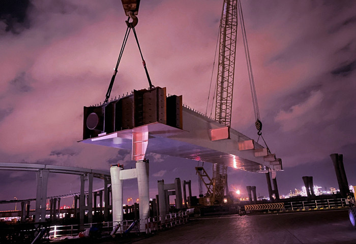 濱?;ネㄖ骶€全長2390米、8座匝道橋5995米的、4座拼寬橋1320米,設634個墩柱、67聯441片鋼混組合梁,使用鋼材31593.7噸、混凝土29418.9立方。鋼箱梁由寧波舟山一廠家生產。去年12月通過海上運輸、碼頭卸裝和轉運,將鋼箱梁運至現場,29日上午架設第一片梁,3天架設3跨6片,受海風、臺風等影響,直到今年6月8日到15日進行第二波架梁,完成12跨24片架梁任務,前兩波共架設30片梁。