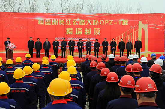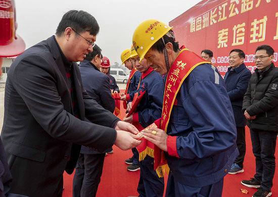 儀式上,蘄春縣人民政府副縣長李國忠致辭;湖北棋盤洲長江公路大橋有限公司副總經(jīng)理、總工程師趙文藝致辭,中鐵建大橋工程局集團一公司執(zhí)行董事、黨委書記王學民致辭;蘄春縣政協(xié)主席蔡緒銀、湖北棋盤洲長江公路大橋有限公司副總經(jīng)理汪應(yīng)軍、中鐵建大橋工程局集團橋梁指揮部副指揮張耀為3名“最美工匠”頒獎;湖北棋盤洲長江公路大橋有限公司董事長、總經(jīng)理汪西華宣布北索塔最后封頂。
