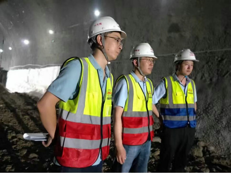 牛浩(右一)陪同項目經理阮超(中)在中梁山隧道進口掌子面進行質量檢查
