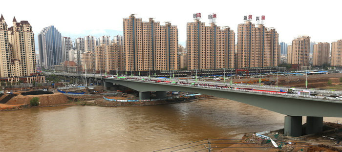 施工中的蘭州雁白黃河大橋北引橋工地2016年4月17日,歷時兩年半施工的蘭州雁白黃河大橋竣工。蘭州市質(zhì)監(jiān)站、蘭州交通大學(xué)聯(lián)合對大橋進(jìn)行動靜載檢測,11臺重量分別為45噸的卡車,分成兩排同步在橋上加速行駛、急剎,儀器測試數(shù)據(jù)顯示,各項(xiàng)指標(biāo)完全達(dá)到或超過設(shè)計標(biāo)準(zhǔn)。至此,以“鳳舞新城”為主題的雁白黃河大橋,成為了黃河蘭州段的又一標(biāo)志性建筑,豐富了蘭州百里黃河風(fēng)情線的景觀內(nèi)容。