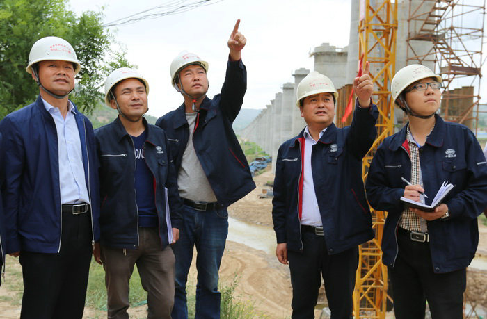 胡湛(左三)在工地向副總經(jīng)理張驊(左一)介紹大橋施工情況 新的時代,新的征程。如今,刀光劍影已不復(fù)存在,唯有建設(shè)者們奮力拼搏的身影。在銀西高鐵建設(shè)中,胡湛被公司任命為銀西鐵路5標(biāo)一工區(qū)常務(wù)副經(jīng)理,在高速鐵路工地續(xù)寫他的筑路夢想。在公司副總經(jīng)理張驊的帶領(lǐng)下,胡湛沖鋒陷陣,在大西北的黃土地上,縱情揮灑筑路激情,用拼搏的汗水,取得了輝煌的勝利。