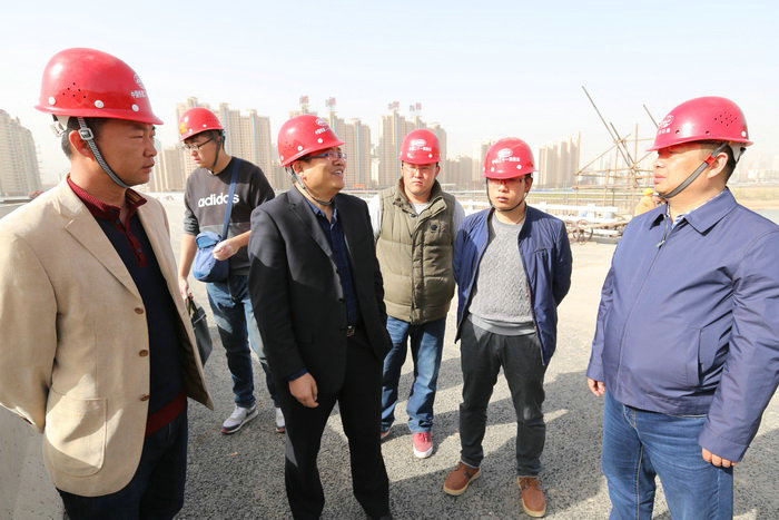 胡湛(左一)和項(xiàng)目班子成員與上級領(lǐng)導(dǎo)檢查工地 雁白黃河大橋全長4034.26米,橋面寬度35米,跨黃河主橋?yàn)?45米,跨徑165米,主橋一跨飛越黃河,為黃河上第一大跨度預(yù)應(yīng)力混凝土連續(xù)梁橋,在全國同類型橋梁中排在前五位,在國內(nèi)市政工程大橋中排名第一。由于北岸與南岸高差達(dá)133米,主橋越過北岸后,經(jīng)過“兩穿”、“兩跨”、“兩繞”、“兩銜接”,以螺旋式展線爬升往北延伸。在黃河上建橋,其技術(shù)含量和施工難度遠(yuǎn)遠(yuǎn)超過一般橋梁。