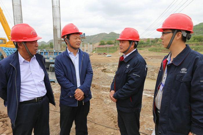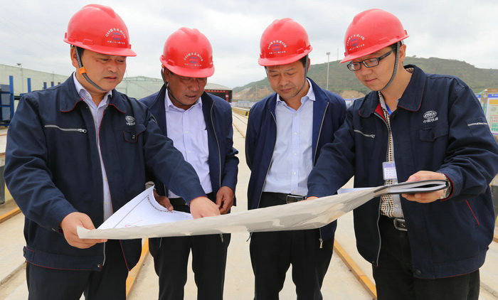 許寶勇(左一)與項目經(jīng)理張驊(右二)、書記李文才(左二)、總工崔正大(右一)查看圖紙