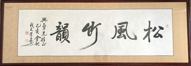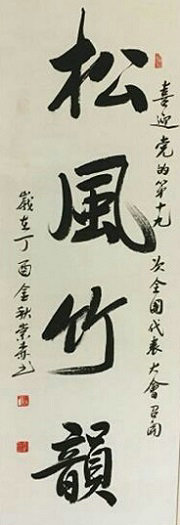 應(yīng)該說(shuō)王崇森戰(zhàn)友的這禎“松風(fēng)竹韻”書(shū)法作品是我倆結(jié)緣的伊始。2017年10月初,我是在微信《政友群》中看到王崇森戰(zhàn)友曬出的這幅作品,這禎書(shū)法是其參加中鐵十五局集團(tuán)公司工會(huì)、老年體協(xié)舉辦的“迎接黨的十九大召開(kāi)、慶祝建軍90周年”老年職工書(shū)畫、攝影作品展上的獲獎(jiǎng)作品。我一看到這幅書(shū)法作品就非常的欣賞與喜愛(ài),尤其是書(shū)法作品中四個(gè)字的詞意也很適合時(shí)宜。當(dāng)時(shí)我就有點(diǎn)心血來(lái)潮地隨即用“松風(fēng)竹韻”四字為題寫了首藏頭詩(shī)發(fā)在微信群中表示點(diǎn)贊與恭賀。