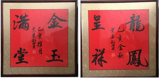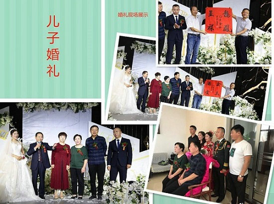 同時(shí)帶來(lái)的還有“情滿天山”豎向書(shū)法一禎,當(dāng)劉合坤戰(zhàn)友展開(kāi)作品時(shí),我是非常的興奮與喜悅,自然心情激動(dòng),立馬浮現(xiàn)出在新疆天山參建南疆鐵路的場(chǎng)景。真可謂是心有靈犀,我也曾在2012年寫過(guò)《難忘天山歲月》的文稿,同時(shí)刊登在《鐵道兵戰(zhàn)友網(wǎng)》《中國(guó)鐵路工程建設(shè)網(wǎng)》??吹竭@幅精美的書(shū)法作品與詞意,自然會(huì)激起我想起曾在天山深處的那段難忘歲月。也正是因?yàn)橛辛四俏迥甓嘣谑┕みB隊(duì)的艱苦歷練,才讓我養(yǎng)成了無(wú)論施工有多累、有多忙,每天都要擠出兩小時(shí)左右來(lái)系統(tǒng)地讀書(shū)學(xué)習(xí),堅(jiān)持一星期要寫一篇《每周一文》,直到現(xiàn)在我還保持著這個(gè)習(xí)慣。兵改工后,我被單位推薦外送地方中醫(yī)院校進(jìn)修學(xué)習(xí)并考取中醫(yī)師資格證,由此才改變了我的職業(yè)生涯。之后的三十多年,除了喜愛(ài)讀書(shū)的習(xí)慣沒(méi)變外,在企業(yè)的幾次改制中也兼職過(guò)幾種其它工作,直到退休仍然是保持原地踏步,初心未改。2019年9月26日,是我兒子結(jié)婚的慶典日期,原本著婚事從簡(jiǎn),不擾動(dòng)過(guò)多的親戚朋友、同學(xué)、戰(zhàn)友。王崇森戰(zhàn)友可能是從合坤戰(zhàn)友處得知的這個(gè)信息,于是寫好了這兩禎喜慶的墨寶讓合坤戰(zhàn)友帶到了婚禮現(xiàn)場(chǎng),在婚慶主持人的策劃下,由劉合坤和郭圣柏兩戰(zhàn)友在婚禮現(xiàn)場(chǎng)進(jìn)行展示。這一別開(kāi)生面的婚慶程序安排,即刻將婚禮現(xiàn)場(chǎng)推向了歡樂(lè)喜慶的高潮,也展現(xiàn)出了我們鐵道兵人的文化底蘊(yùn)與特色創(chuàng)意,受到了婚慶現(xiàn)場(chǎng)眾多親朋好友與戰(zhàn)友們的共同好評(píng)與點(diǎn)贊。在此我再一次的向王崇森老戰(zhàn)友,劉合坤戰(zhàn)友,郭圣柏戰(zhàn)友表示衷心的感謝!