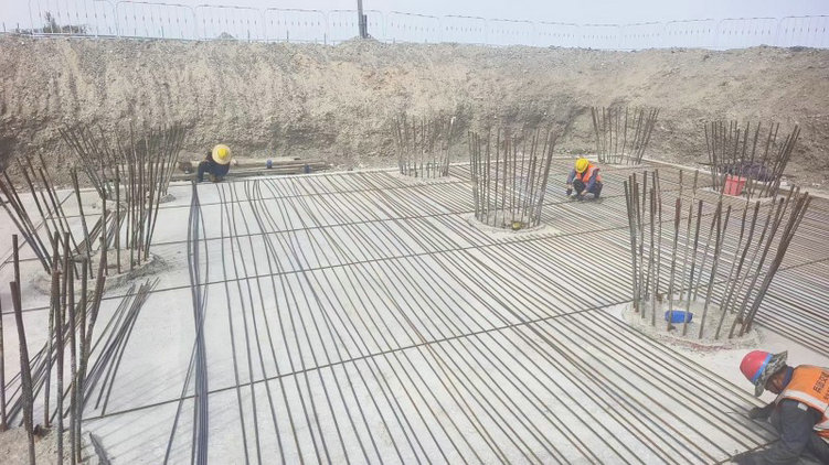 圖為新疆兵團(tuán)建工水電集團(tuán)市政路橋公司第五師雙河市G577沙山子-G219線公路(互通立交工程)RA匝道K0+475.756大橋0#橋臺,承臺底層鋼筋網(wǎng)片綁扎。(王小丫 攝)