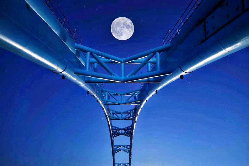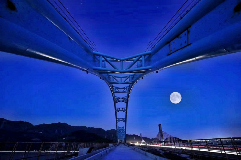 9月,秋意愈濃,清晨的日出及夜晚的月色撒在金臺鐵路靈江特大橋上,與自然融為一體,磅礴之余又多了些柔美、靜謐。
