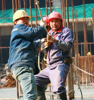 結(jié)合,才使我國經(jīng)濟(jì)走上了快速發(fā)展之路,也是“尊重勞動、尊重知識、尊重人才、尊重創(chuàng)造”的精神所在和實(shí)質(zhì)表現(xiàn)。如今就有不少農(nóng)民工自豪地說:“只要掌握技術(shù),有絕活兒,就不愁沒活兒干。”在我們項(xiàng)目上有位叫彭兆陽的農(nóng)民工師傅說:“我從十七歲開始學(xué)習(xí)電工電焊,開鉆機(jī)和機(jī)械修理,快二十年了,一個(gè)月掙四五千元很正常,干得好老板還會漲點(diǎn)工資,年底另有獎金。”下面是筆者無意間從佛山市華陽特大橋建設(shè)工地上,用數(shù)碼相機(jī)拍攝到的農(nóng)民工工作照,你能說這些農(nóng)民工兄弟不是人才嗎?