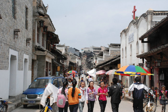 圖為幾名少先隊員放學(xué)從翹街走過          參觀完黎平會址,我獨自一人漫步在黎平的大街上,黎平縣城不大,馬路和街道兩旁的房屋也比較老舊,沒有多少太高的建筑,畢竟是西部邊遠(yuǎn)地區(qū),黎平的經(jīng)濟(jì)發(fā)展還是比較緩慢,今年三月份,黎平縣才實現(xiàn)脫貧,正式退出國家貧困縣序列。這里遠(yuǎn)離都市的喧囂,當(dāng)?shù)厝藷崆橛焉疲凶咴诖蠼稚?,這個時候你什么都可以想,什么都可以不想,真正的會讓你身心得到徹底的放松。