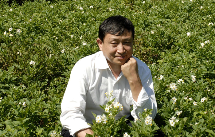 初夏,放養(yǎng)的花牛在啃食剛發(fā)芽的嫩草